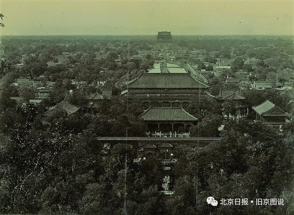 从景山万春亭北望寿皇殿、地安门遗址和鼓楼。蒂格森拍摄的这张照片十分珍贵,从中我们可以清晰地看到地安门被敌军炮火轰塌,仅存遗址。照片中,地安门内有四个大水潭。这里地势低洼,一到雨季就会形成水潭,直到民国初年改造后才彻底好转。