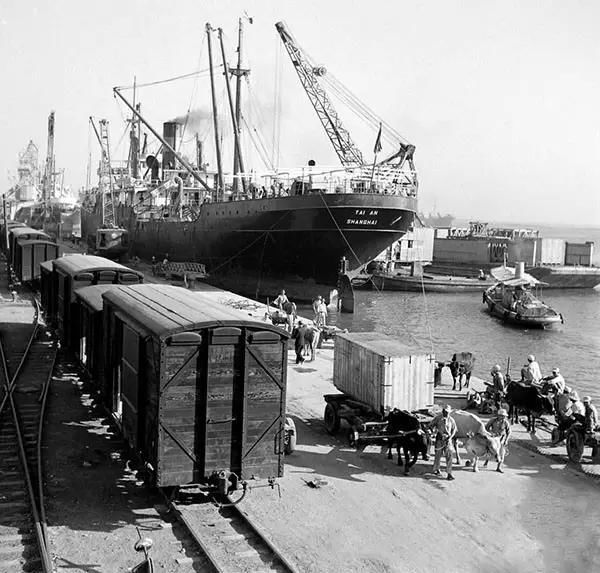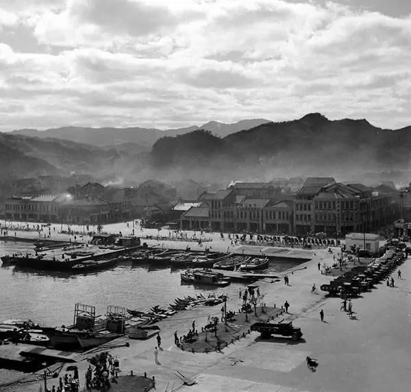 1950年,台湾,鸟瞰基隆港口,码头上工作的人。