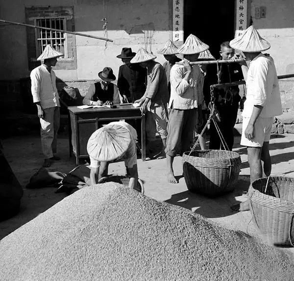 1950年,台湾,农民和农业专家研究小麦作物生长。