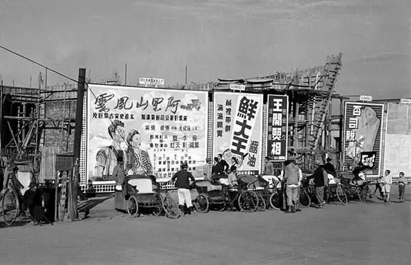 1950年,台湾,在一个大广告牌前等待载客的人力车。