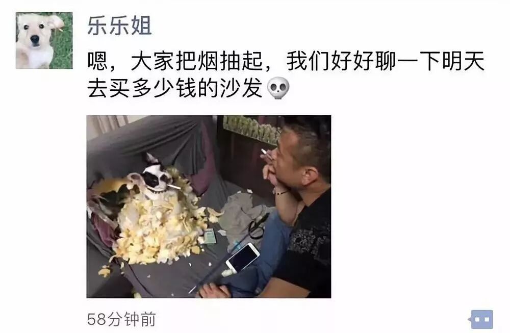 家里的傻狗把沙发刨得稀巴烂。老公看着满地狼藉,思索了几秒,默默点了烟。