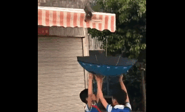 后来这两个男孩担心小猫受伤,撑开了雨伞。他们双手托着雨伞,眼神跟着小猫,来回移动,生怕它不小心跌落,受伤。大概是被两个男孩的真诚打动,终于,小猫选择相信他们,勇敢纵身,跳了下去。
