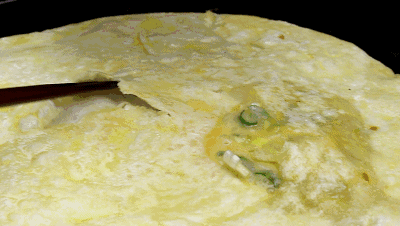 一见面,看他们如何操作,则更加确定我的直觉。一个健健康康的妇人,站在店门口,专门负责给刚煎好的蛋饼抹酱,并招呼客人和收钱。我一看那蛋饼,则更加确定就是我小时候那种做法。这么多年,吃过这么多蛋饼,仅看厚度就能够确定是不是我要的那种蛋饼。我家乡的蛋饼是那种微厚的,比北方直接在锅里摊、或街头巷尾充斥的杂粮卷饼、鸡蛋灌饼,都要厚。家乡的蛋饼,是厚实的、胖重的、可喜的,而且一定要当着你的面,灌一个鸡蛋进去。那家就是这样。但是它不像我们小时候放榨菜,而是抹一层自家制的酱。那个酱,浓郁、丰富。不仅有辣的味道,更有切碎的韭菜和绿色不知名菜,以及葱。那么抹到饼子上的绝不只是一层酱,而是那个蛋饼的灵魂。