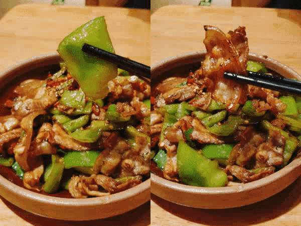 青椒在湖南更是运用到炉火纯青出神入化的境地。青椒可配万物:青椒小炒肉、青椒皮蛋、青椒田螺、青椒青菜……荤素一概不能免俗。这些青椒菜色表面清新甜怡,等你下箸后才会追悔莫及,但一口回神,立马又被征服,因为实在是忒下饭了。令人销魂的还数辣椒炒辣椒,当地独有晒干的白辣椒,以及“青红双煞齐飞”的剁椒鱼头,爽辣彻骨,灼烈直白,全然承载着故乡的痛快豪迈。