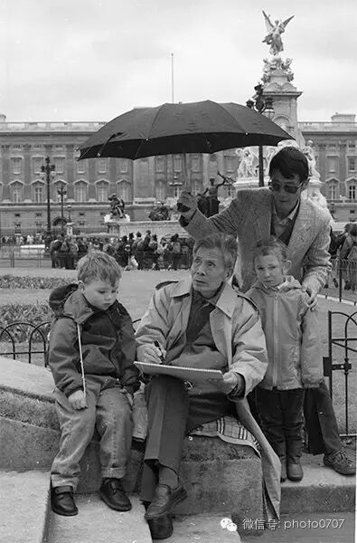 ↑ 吴冠中很早就开始油画民族化的探索,在当代世界多元的文化语境中,吴冠中先生找到了具有自己代码的艺术语言,并得到了世界艺坛的认可。1992年,大英博物馆打破了只展出古代文物的惯例,首次为在世画家吴冠中举办“吴冠中——二十世纪的中国画家”展览。我当时在伦敦当驻外记者,给吴先生当了把司机。这是他在白金汉宫前写生。