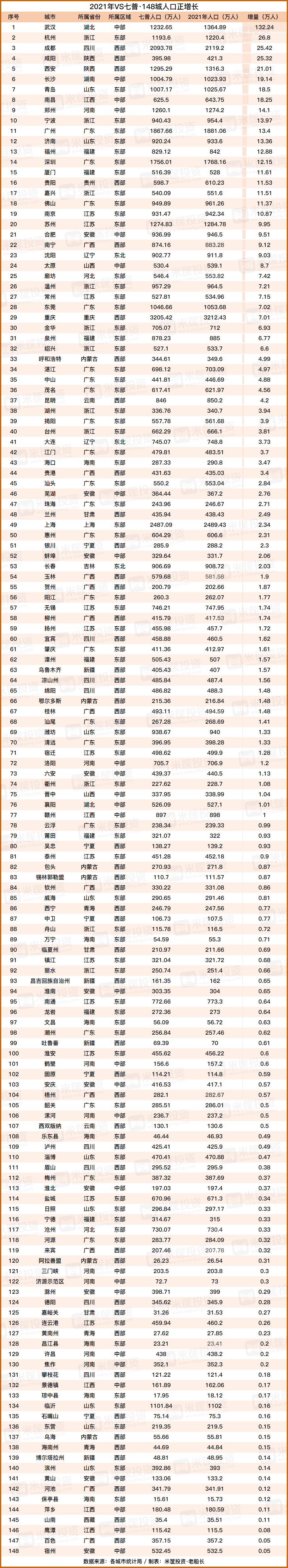 3)因多数城市并未公布2020年年末常住人口数据,所以文中用2021年常住人口与七普数据相比较,得出人口增长数据时间段为一年零一个月,非一整年数据。