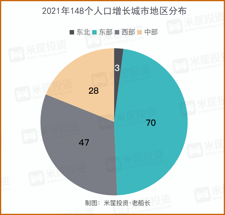 7)148个人口增长的城市,有70个分布在东部,占比接近一半;中部只有28个,西部有47个,东北仅有3个(沈阳、长春、大连)。