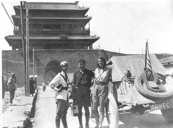 1946年左右,在西直门城里,从东向西拍摄的西直门城楼。镜头前面有一辆美式吉普车,车后面插了一面美国国旗,汽车旁边站着三位美国人,仔细看他们的身后,好像还有一辆吉普车,两辆车的车头都是朝西的,不知道他们出西直门要去哪里。