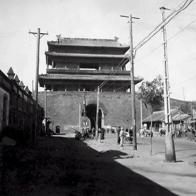 1950年,在西直门城里马路南侧的便道上向西拍摄的西直门城楼,看照片上的情况,应该是还没有在西直门城楼两侧挖门洞,进出西直门还是要走西直门瓮城,只不过解放之后晚上就不关城门了。