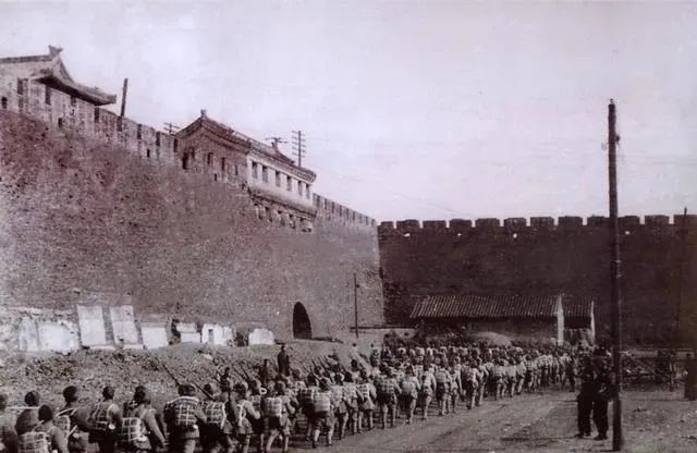 1949年,西直门城楼东面,坐着十轮大卡开进城的解放军