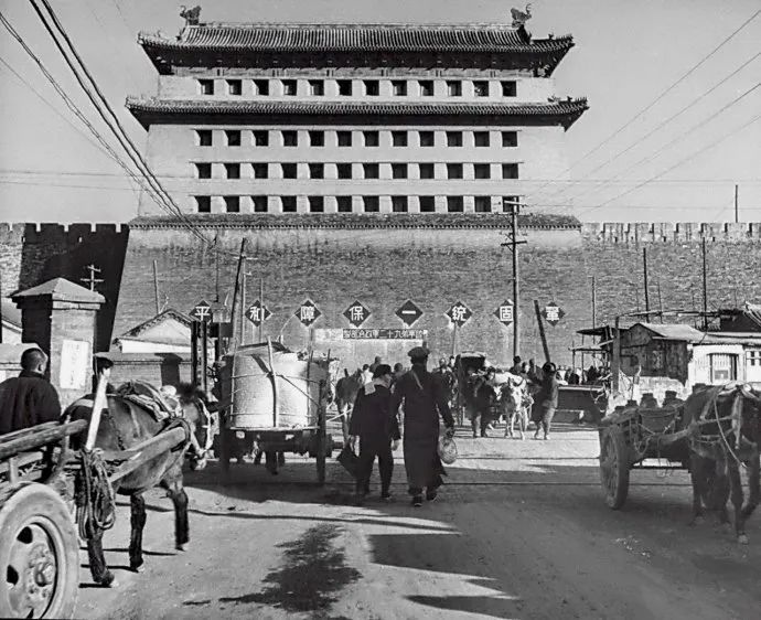 1946年,拍摄者在西直门外铁路的西侧,也就是东关的马路上朝东拍摄的西直门箭楼。这时候国民党在箭楼城台上重新刷上了标语,内容是:巩固统一保障和平,看马路上有很多辆马车,进城的、出城的都有,那时候马车是主要的运输工具。