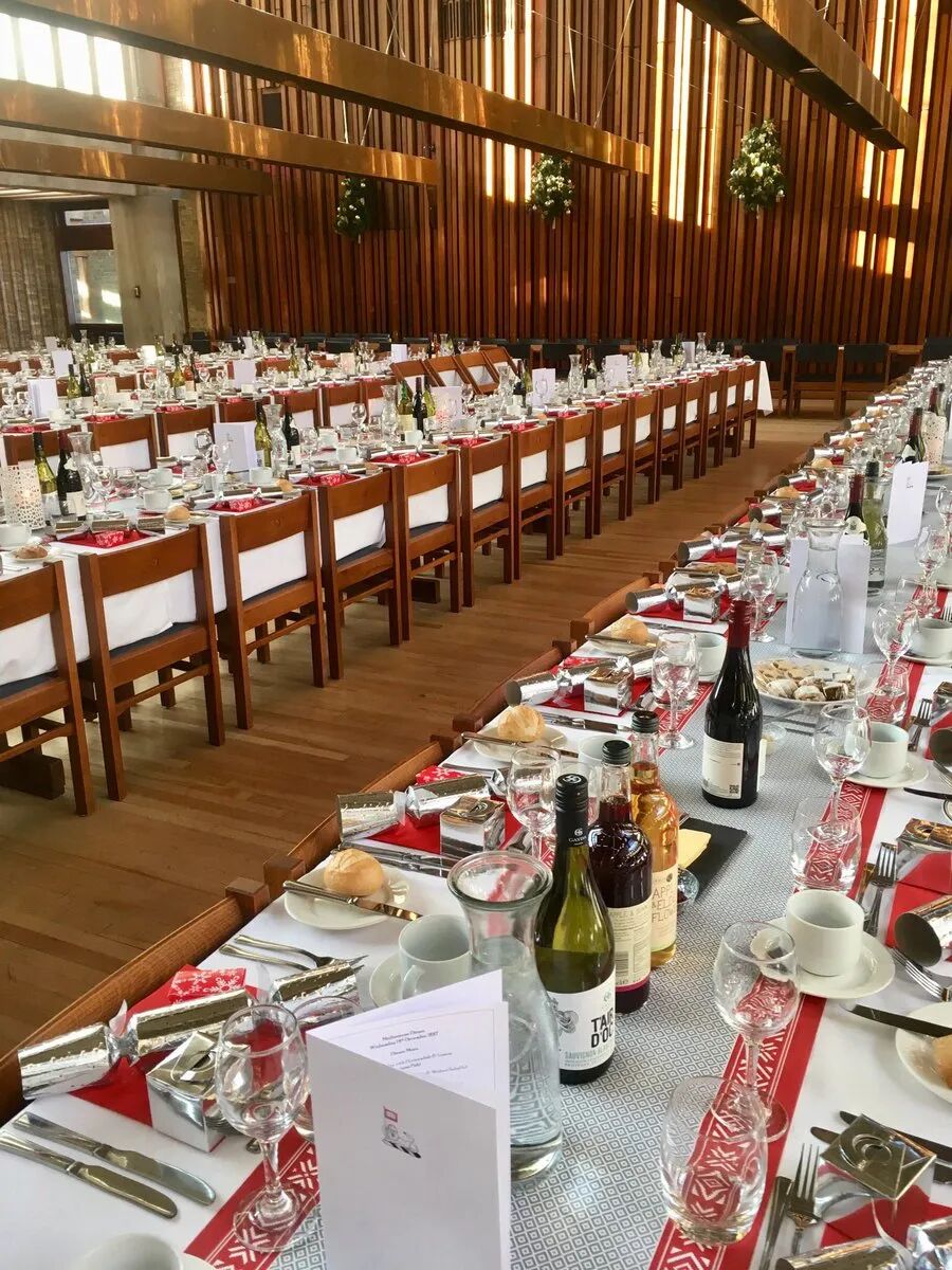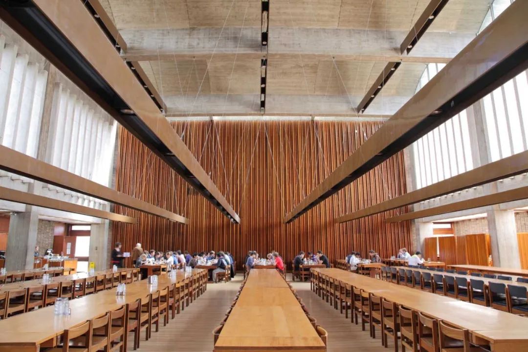 丘吉尔学院的食堂,在一众食堂中尤其一骑绝尘。虽然装饰上是简单的现代主义风格,由 Sheppard Robson 和 Partners 在 60 年代设计,是剑桥第一座现代主义建筑,并激发了该校在建筑设计方面的风格变化。