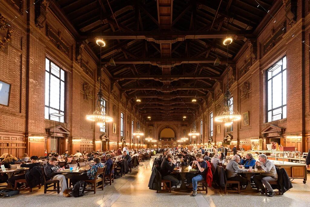 哈佛大学最著名的食堂,安妮伯格食堂(Annenberg Dining Hall),用餐空间位于纪念馆内,是一座维多利亚时代的哥特式建筑。其内部更是如哈利波特魔法宫殿般梦幻。