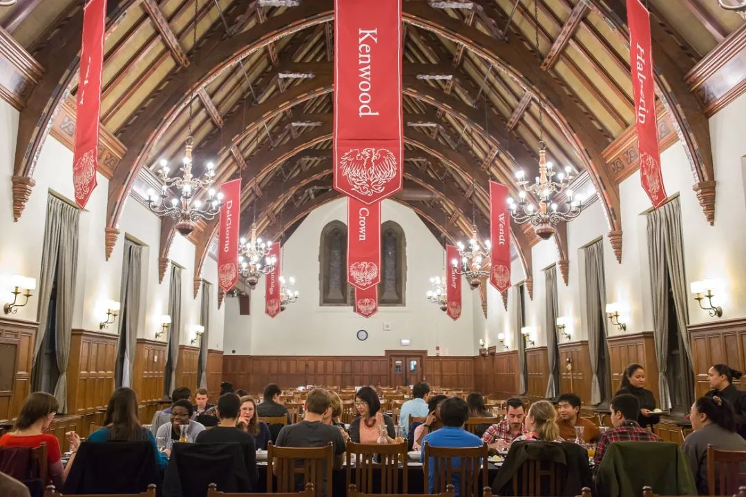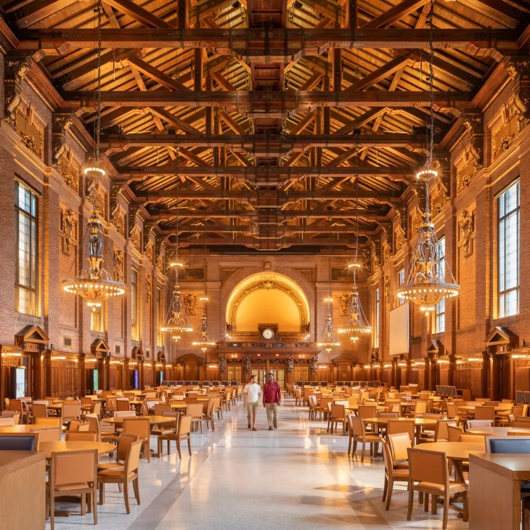 芝加哥大学南校区的凯西餐厅,拥有许多精致的建筑细节,包括雕纹深色木质天花板、蜡烛风格的枝形吊灯和木质护墙板等,为饭堂缔造了一种古色古香的感觉。