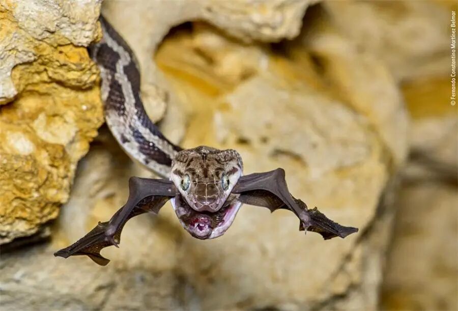 墨西哥尤卡坦鼠蛇抓住蝙蝠,据统计它要出击200次才能抓到1只蝙蝠。