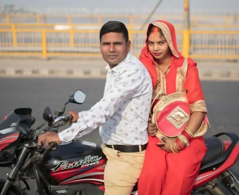印度夫妻在亚穆纳河大桥上拍照,摩托车是大多数印度年轻人的选择。