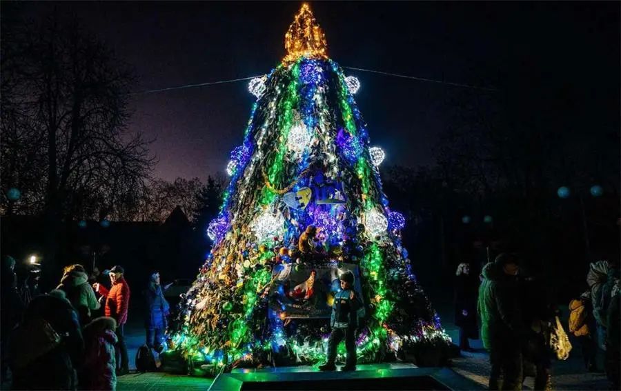 乌克兰人用战地伪装网制作灯饰树,以欢度圣诞节。