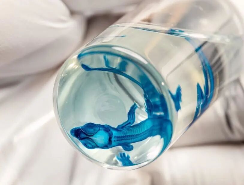 玻璃瓶中的变色龙胚胎,清楚地展示了它的骨骼解剖结构。
