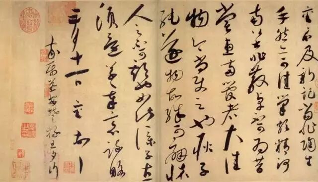 张长史折叉股,颜太师屋漏法,王右锥画沙。印印泥,怀素风鸟出林,惊蛇入草,索靖银钩虿尾,同是一笔法:心不知手,手不知心法耳。——黄庭坚《论书》