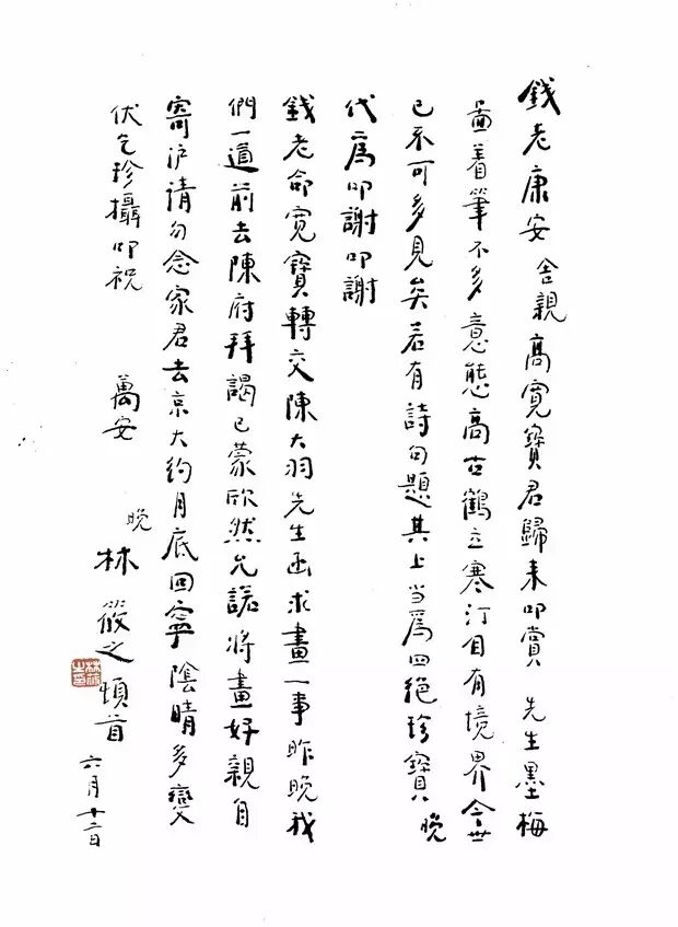 钱老命宽宝转交陈大羽先生函求画一事,昨晚我们一道前去陈府拜谒,已蒙欣然允诺,将画好亲自寄沪,请勿念。