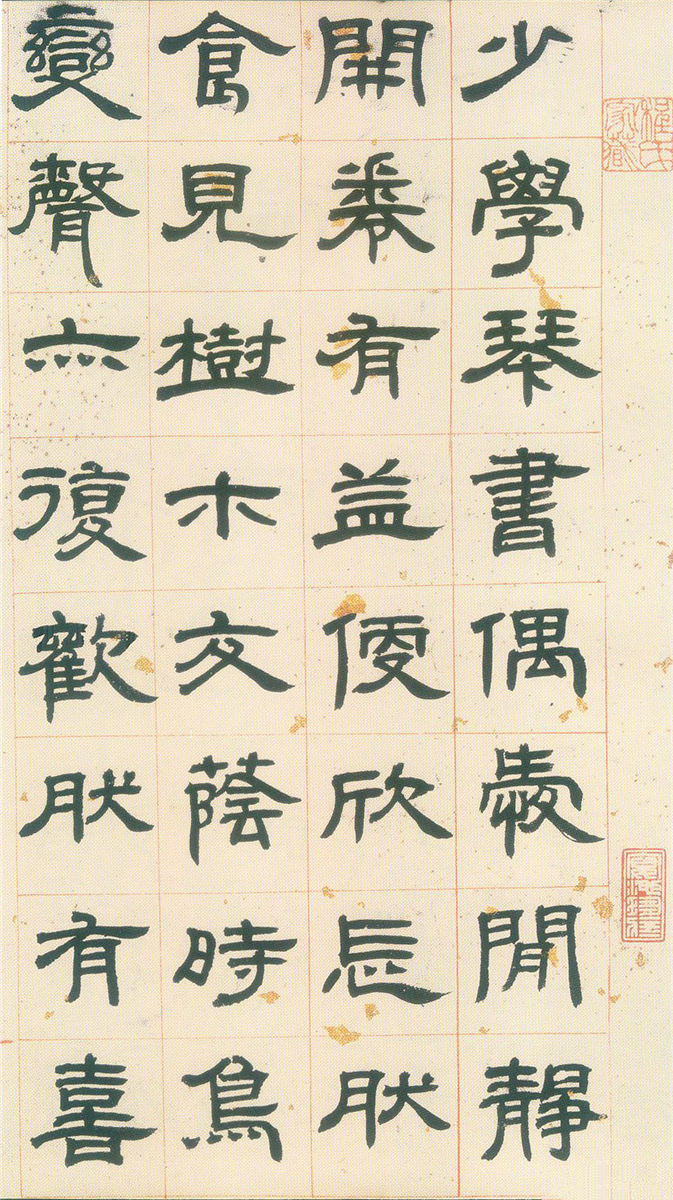 这本隶书册,作于嘉庆己未(1799)年。体势值由雅驯而趋开张,笔意由温润而趋劲豪,气格宏阔而无纵横习气。是一件由厚积走向勃发之际的别致的佳作,多堪玩味。
