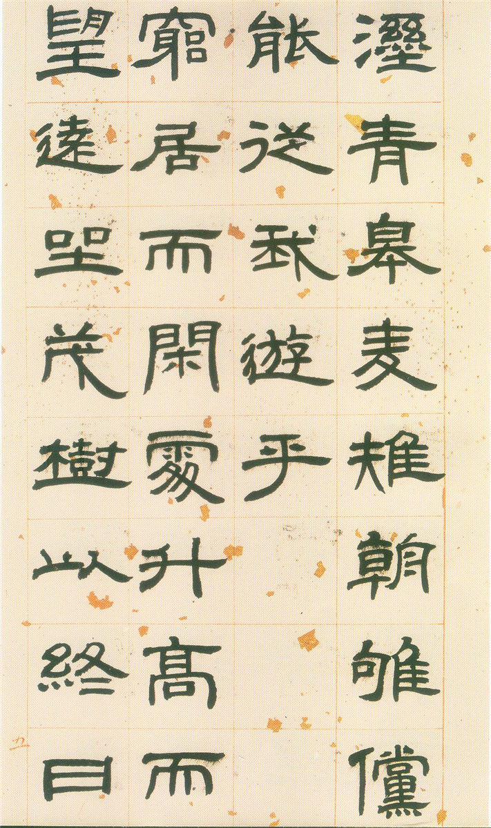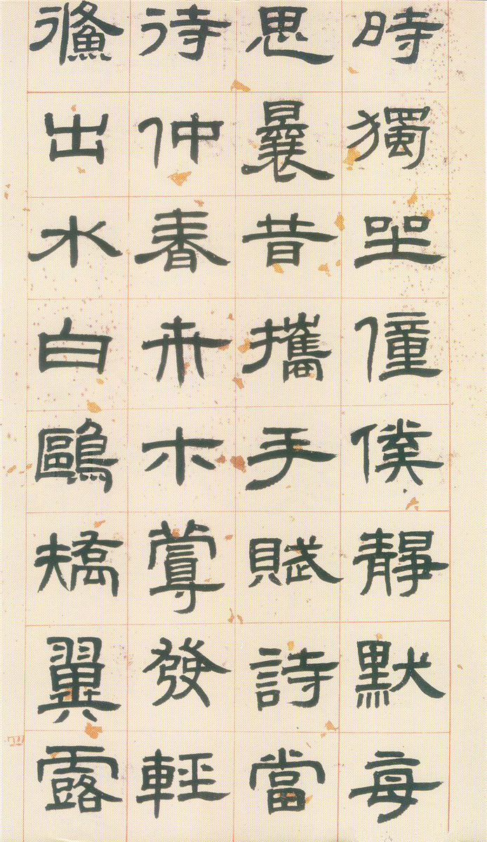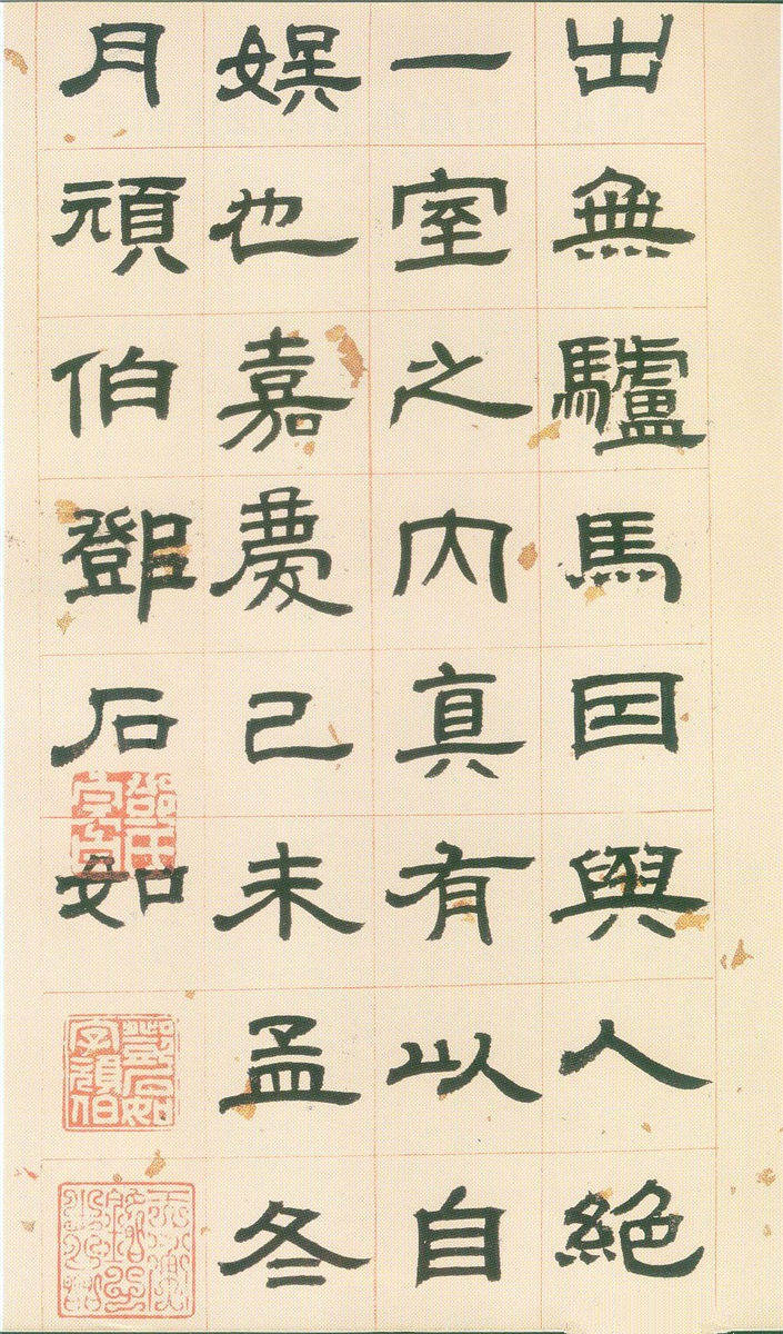 诚然,邓氏四体皆擅,毕竟有文野、雅俗之别。他的篆书以隶笔发势,得前所未有的纵横捭阖之妙,一洗先前作篆描划纤弱之弊。隶书杀锋取劲,若钢刀之刻石,自具精气弥满, 一洗明清人刻板做作之弊。篆隶以其最强项,开风气之先,对后世影响也巨。故赵之谦有“山人书以隶为第一”之誉。诚然,笔者以为其行草,似少了些清狂之趣,而稍涉俚俗,这或许是才人多艺,不免有其精力不逮处;也许是对篆隶书过于追求雄强,而在行草上衍生出率意轻漫的心态。这也是不可苛求的。