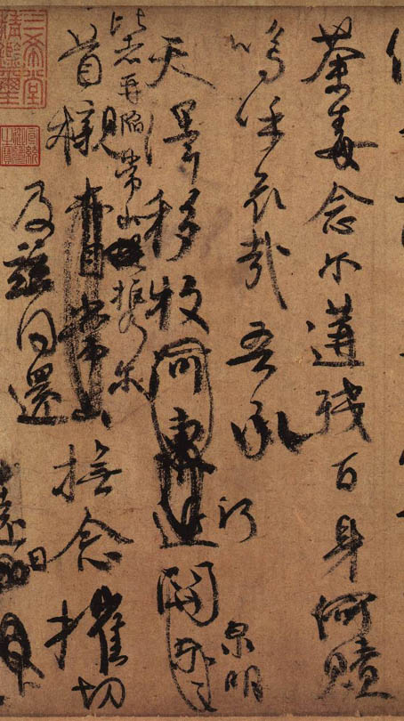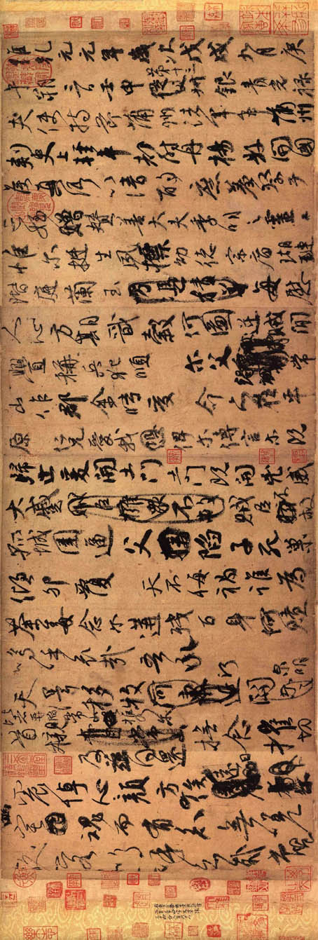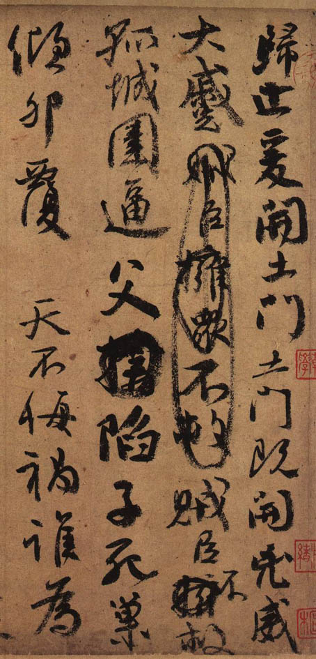 此稿一反“二王”茂密瘦长、秀逸妩媚的风格,变为宽绰、自然疏朗的结体,点画外拓,弧形相向,顾盼呼应,形散而神敛。字间行气,随情而变,不计工拙,无意尤佳,圈点涂改随处可见。在不衫不履的挥写中,生动多变。可以强烈地感受到刚烈耿直的颜真卿感情的起伏和渲泄。行笔忽慢忽快,时疾时徐,欲行复止。