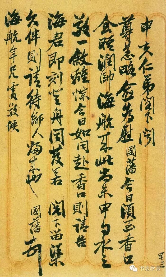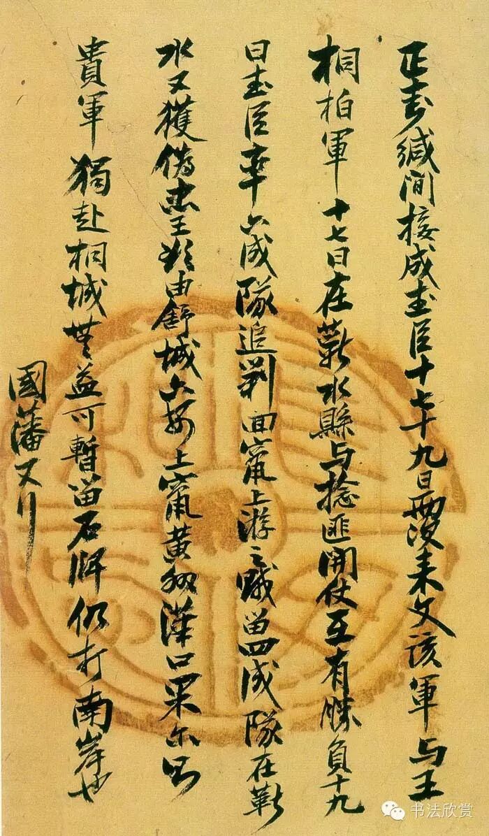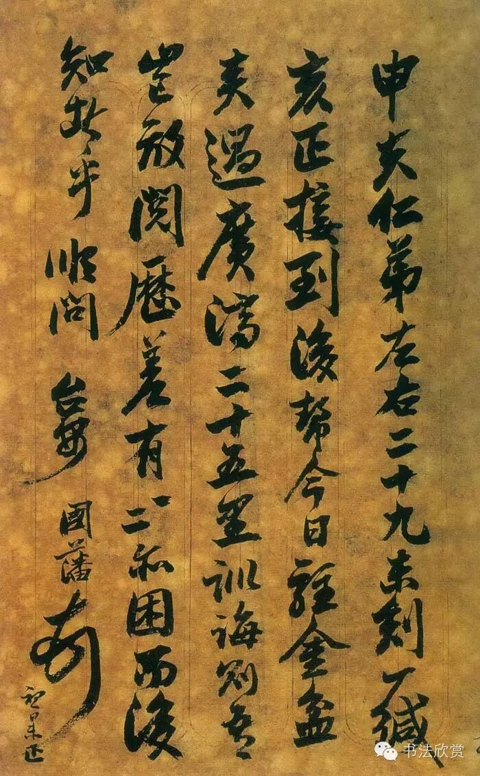 曾国藩以文治武功名世,书法实乃余事。“传世也无俟于书。顾平生于书,博习穷挥,未尝稍懈。生平欲将柳诚悬、赵子昂两家合为一炉。”(马宗霍《霎岳楼笔谈》)曾国藩自述学书云:“吾自三十时已解古人用笔之意……欲将柳诚悬、赵子昂两家合为一炉,亦为间架欠工夫,有志莫遂。”又云:“余既奉欧阳率更、李北海、黄山谷三家以为刚健之宗,又参以褚河南、董思白婀娜之致,庶为成体之书。”此种审美价值取向,明显表现出时代书法审美影响的痕迹。身处成、同碑学大播之际,曾国藩不可能不受到碑学之沾溉,但作为庙堂重臣,正统的书法审美趣尚也同时左右着他,使其不可能轻易寄兴于民间化北碑趣味,率尔染指。因而他选择欧阳询、李北海、柳公权便具有权宜之计,既不失庙堂正格又具碑之刚健;至于取法赵子昂、董其昌,则为皇家正统趣味之感染。这种审美选择也颇为合乎曾国藩处世做人之道,外圆内方,汩于世情而内坚操守。应该说,曾国藩在很大程度上实现了他的审美理想。其书沉郁雄挫,骨力内蕴而不失遒媚。更为可贵的是,其书作风格不拘,在庙堂气中保持着多样化的风格面目。取法的书家也不限于欧阳询、柳公权、李北海、褚遂良、黄山谷、赵孟烦,而是转益多师,博涉为优,于颜鲁公、何绍基皆有采撷。