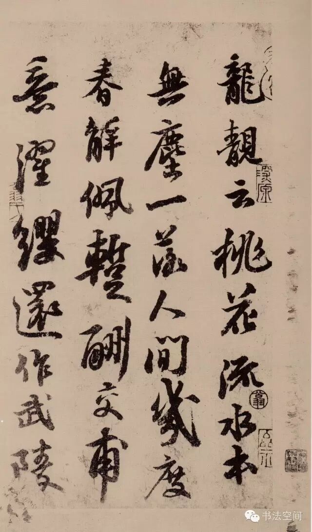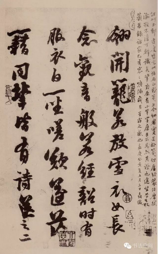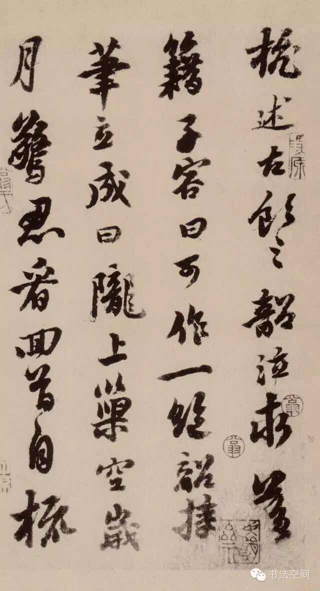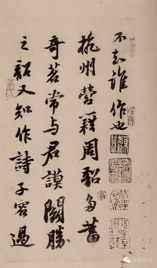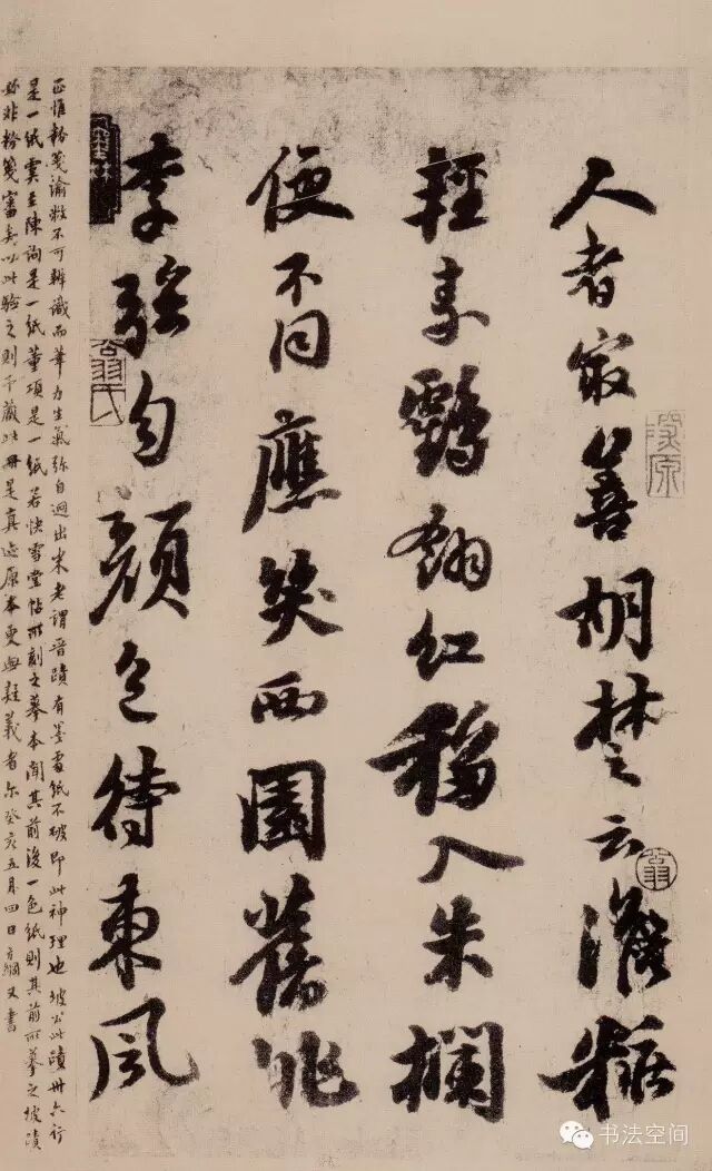 笔力雄厚,却能书写随意;宗法传统,却能时出新意,这是苏氏在此帖中为我们展示的驾驭笔墨的非凡才能。作为尚意书风的主要代表,苏东坡的艺术追求,从来就是强调自我发挥,挥洒性情。他屡屡自道『我书意造本无法,点画信手烦推求气强烈地抒发了一种不为绳缚,崇尚自我和自然的艺术情感。欣赏此帖,能感受到作者从头至尾都处于一个心手双畅,兴到笔随的精神状态。字势的映带关联,字态的率意洒脱,字列的大小错落,都营造出一种顺乎自然的艺术情景。所谓『不矜而妍,不束而严,不轶而豪,萧散容与,霏霏如甘雨之霖,森竦掩映,熠熠如从月之星,纡余宛转,缅缅如萦茧之丝气显现出诗一般的美感。