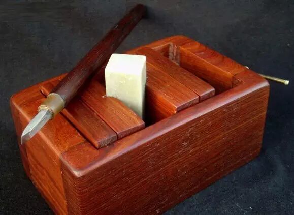 初学用印床便于动刀,但熟练者常不用印床,以便执石之手灵活转动配全合受刀,印床有木制、金属制多种,自制印床价廉实用。(只要买一付元宝螺丝)。