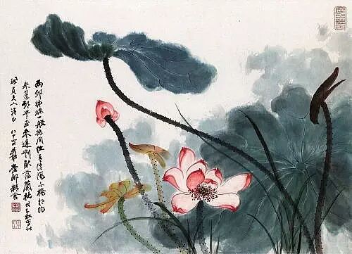 张大千的荷花素净纯美,亭亭玉立又不失潇洒飘逸,将“静若处子,动若脱兔”两种对立之美糅合其中,远观之仙气十足,与周敦颐莲之“不可亵玩”的高洁性情甚符。