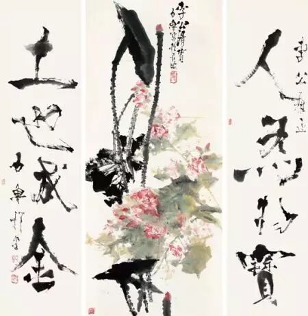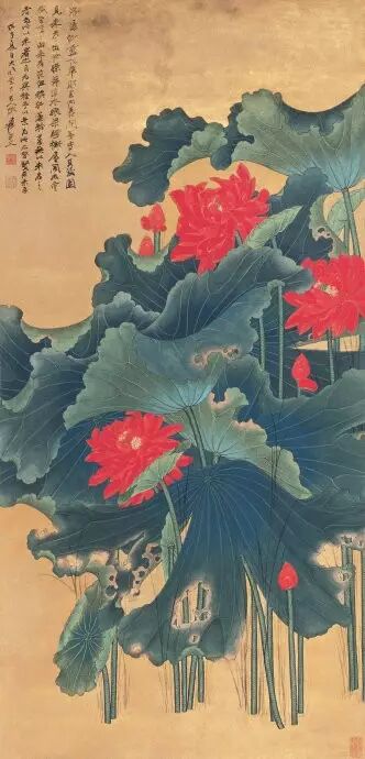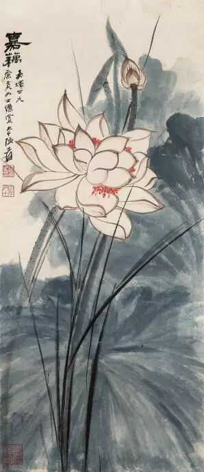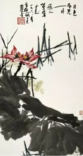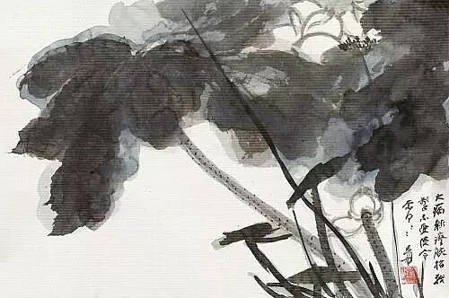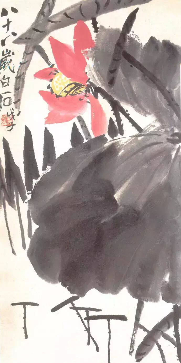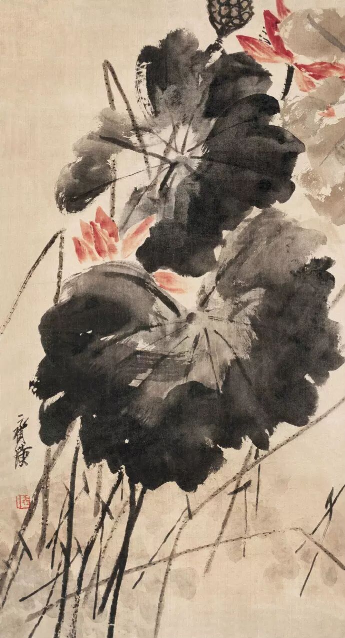 潘天寿的荷花笔墨苍古、凝炼老辣,且大气磅礴,雄浑奇掘,具有摄人心魄的力量感和现代结构美。