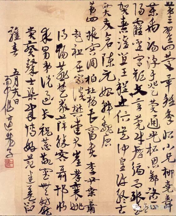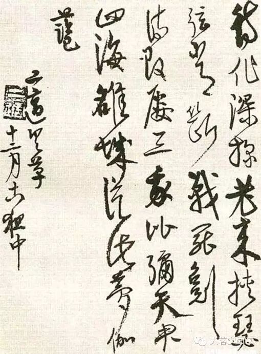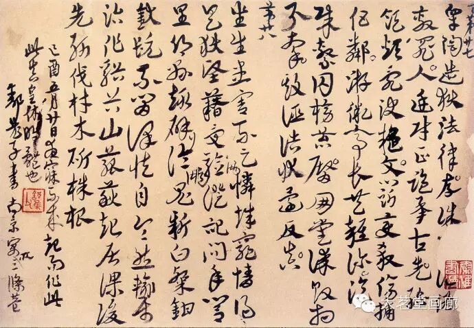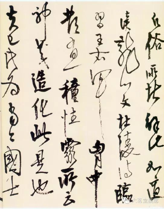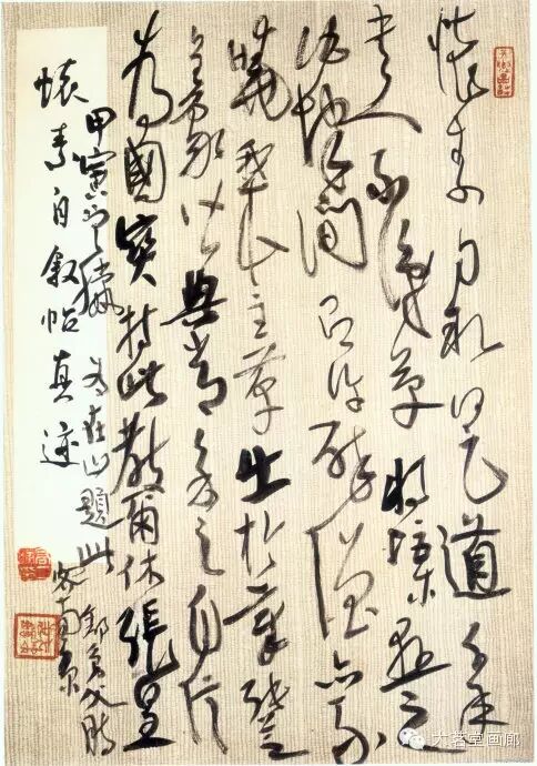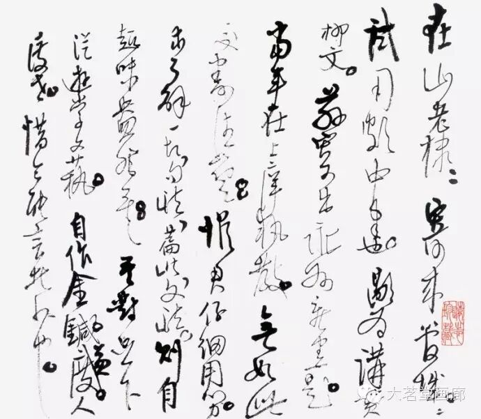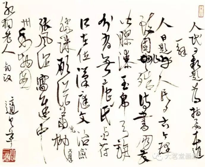 高二适暮年常作狂草书,或行草书以狂草的气势为之。这不仅需要有过人的功力与识见,更需要盖世的胆气与天赋。高二适致力于此道晚于毛泽东,有时隐约受到毛泽东书法的影响。究其原委,实因审美趣尚与气质相近之故。欣赏纪念馆藏高二适晚年巅峰之作《南都帖》,不由让人联想到毛泽东所书《忆秦娥·娄山关》、《沁园春·长沙》、《清平乐·六盘山》等诗词手迹的书法意趣,那种笔挟风云、墨舞龙蛇般的翰墨风采,大有山岳震动、江河奔腾之势,令人叹为观止。