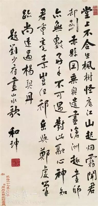 和珅以善窥上意博得宠幸。史载:“高宗(乾隆)若有咳唾,和珅以溺器进之。”视君如父。乾隆一生喜爱作诗,和珅对乾隆帝所作诗词的风格、用典、喜用的词句都知道得一清二楚。和珅为了迎合乾隆帝,下功夫学字、写诗,并且造诣很深。在和珅的《嘉乐堂诗集》中,就有很多首是奉乾隆帝的命令所为。现在看到的北京故宫重华宫内屏风上的诗文是乾隆帝书写,而挂在故宫崇敬殿的御制诗匾,据考证就是由和珅代笔,从这里可以看出和珅诗文书法之造诣。