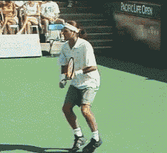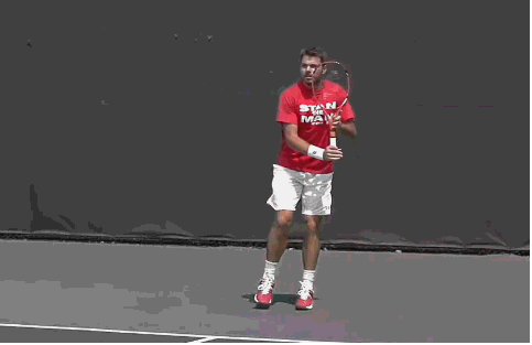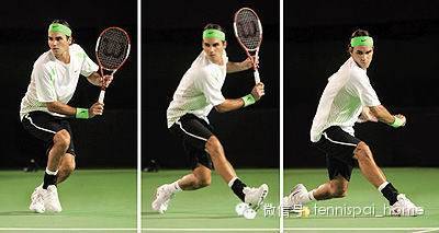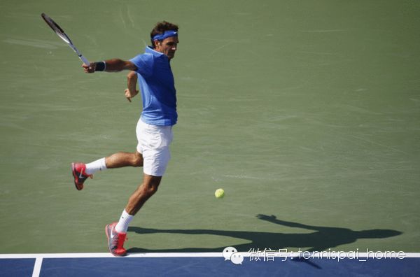单反击球对转体的要求和正手是完全不同的!在球拍通过击球点的过程中,身体几乎是没有转动的(看下图),这时,几乎完全是靠重心的转移和手臂杠杆的抬起和推动进行击球。注意费德勒的左手同时向后打开,就是为了防止身体的过早展开!