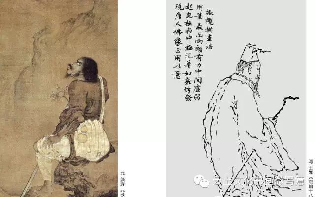 其运笔刚劲有致,质朴简率,秃苍老硬,强调骨力的表现,犹如钉在地上的细木桩,和钉头鼠尾描有相近之处而显短粗。这种线描技法,在宋代已很流行,当时的马远、晁补之等人都善用此法,并一度成为当时画家表现文人隐士所惯用的技法程式。如马远的《孔丘像》,采用秃而枯渴的笔法,以浓重、壮实的笔墨表现较硬的麻质布料,在每根线条的中部都呈现出一种强有力的转折,收笔时则略为收缩。