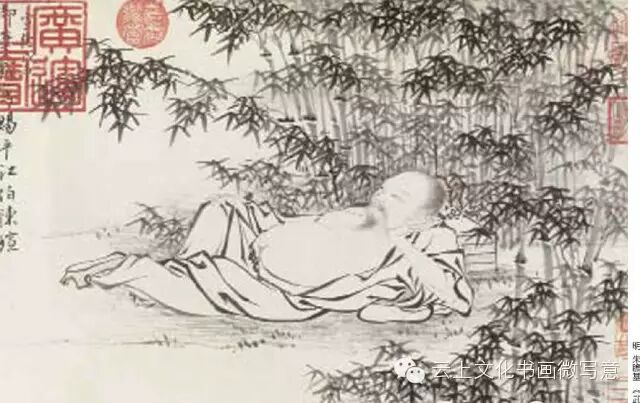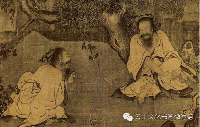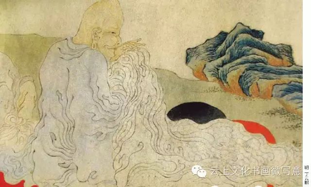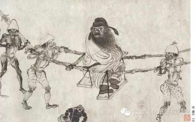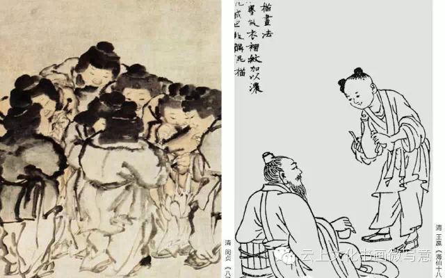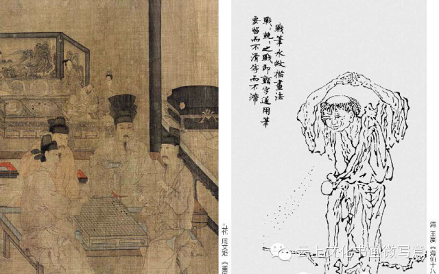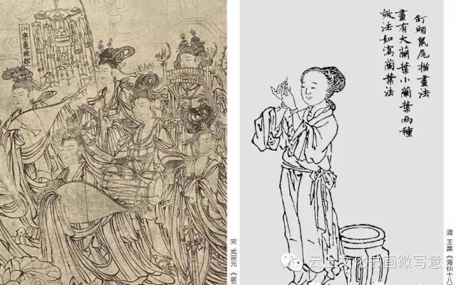 此描法宜中锋用笔,笔法如行云流水,活泼飞动,有起有倒。此法以李公麟的描法最为典型。元代汤垕《画鉴》中说:“(李伯时)惟临摹古画用绢素着色,笔法如行云流水,有起倒。”如李公麟的《免胄图》,迎风招展的旗帜和土兵身上软质的罩衫,线条流畅,笔意清新,如行云流水,舒卷自如。又如他的《维摩演教图》,所画人物的衣纹线条如行云流水,加上画中墨色浓淡的变化,使画中人物表现出圣洁出尘的风采。
