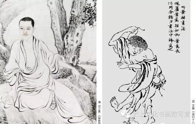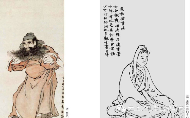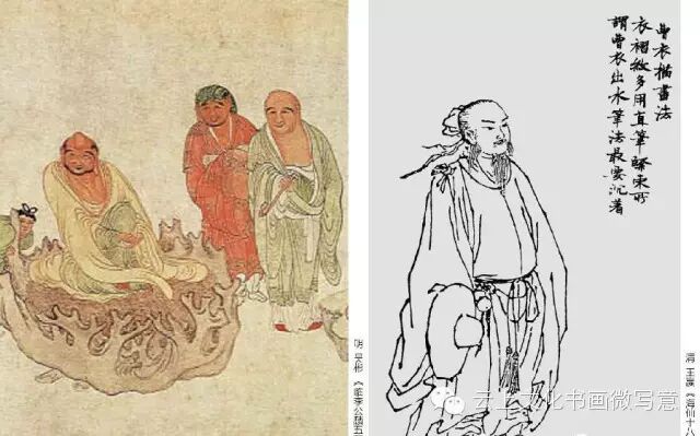 相传曹衣描是北朝著名画家曹仲达受到当时传入的印度美术风格的影响而创造出的。其线条以直挺的用笔为主,质感沉着圆浑,线条细密工致,紧贴身躯,宛如刚从水中湿淋淋地走上来一样,所以又被称为“ 曹衣出水 ” 。北宋郭若虚的《图画见闻志》中就有 “ 曹衣出水描 ” 的记载: “ 曹之笔,其体稠叠而衣服紧窄 ” 。与吴道子风格的 “ 吴带当风 ” 相映辉,丰富了中国画的线描技法。如明代吴彬的《临李公麟五百罗汉图》,罗汉衣纹线条密集,紧贴身躯。正如《点石斋丛画》中所说:“ 用尖笔,其体重叠,衣褶紧穿,如蚯蚓描。” 这种线条,在明代丁云鹏、陈洪绶等人的作品也有体现。