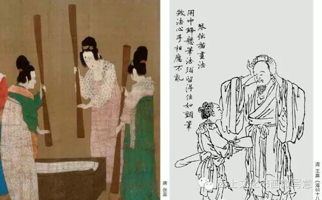 这种描法要求把篆书笔法融于画法之中,似篆书般圆匀遒劲的笔法,以外柔内刚的线条来表现人物的衣纹。如明代丁云鹏的《补纳图》,画中衣纹线条墨色秀润简劲,用线简洁,细劲平直,很好地体现了外柔内刚的衣纹特征。