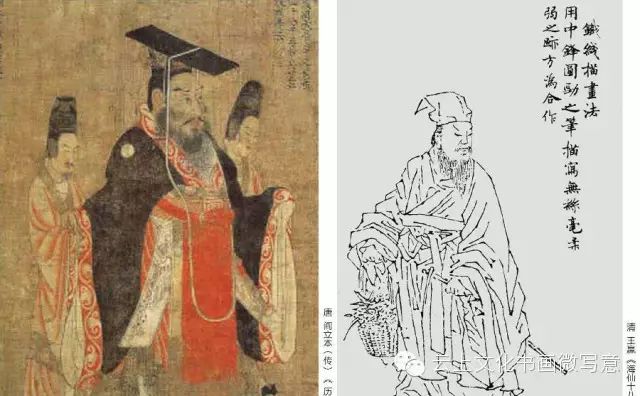 用中锋圆劲之笔描写,丝毫不见柔弱之迹,其起笔转折时稍微有回顿方折之意,如将铁丝环弯,圆匀中略显有刻画之痕迹。在顾恺之、阎立本、李公麟、武宗元等人的作品中,都有“铁线描”的特征。唐代阎立本的《历代帝王图》中,服饰都用中锋细笔勾勒,顿起顿收,笔势转折刚正,如以锥镂石,唤起挺劲有力之感。它体现了书法用笔中的遒劲骨力。这种描法是古代画家表现硬质衣料的重要技法。