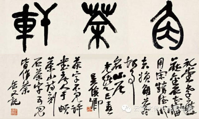“角茶轩”,篆书横披,1905年书,大概是应友人之请所书的。这三字,是典型的吴氏风格,其笔法、气势源自于石鼓文。其落款很长,以行草书之,其中对“角茶”的典故、“茶”字的字形作了记述:“礼堂孝谦藏金石甚富,用宋赵德父夫妇角茶趣事以名山居。…茶字不见许书,唐人于茶山诗刻石,茶字五见皆作荼…"