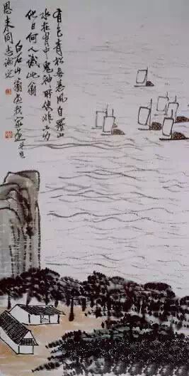 齐白石的赠送给周恩来总理的这幅《松帆图》作品,是《风帆图》的姊妹篇,画作以万里波涛取代留白,山、树、房屋集中在画作的下半部分,呈现出“不对称的平衡”式布局,堆砌感一扫而空。