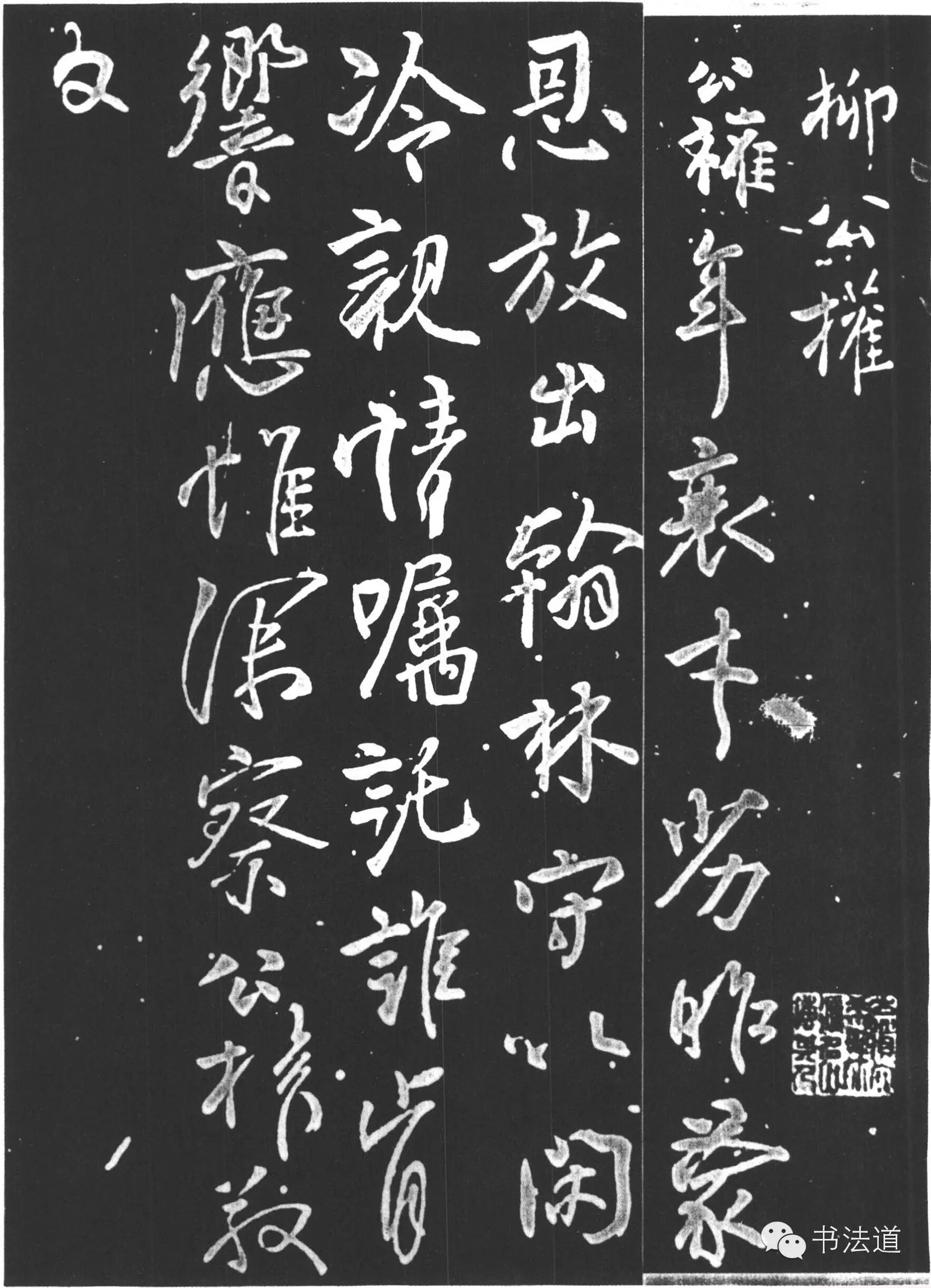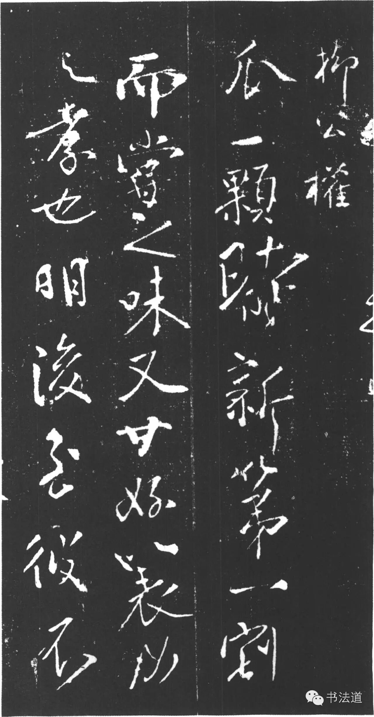 此帖也称《翰林帖》,曾刻入《快雪堂》、《三希堂帖》等。用笔雄健,气势豪宕。第一行“公权蒙”三字联绵出之,字硕大,笔力纵横,如见柳公权血气方刚,精魄四射。其后三行笔走龙蛇,曲折连环;行间大小错落,锋出则破空杀纸,游丝则刚柔兼济,气势一泻无碍。后三行,虽字由大而趋小,随手变格,转换出瘦劲面目,然而气脉贯通,豪气流荡至于终篇。