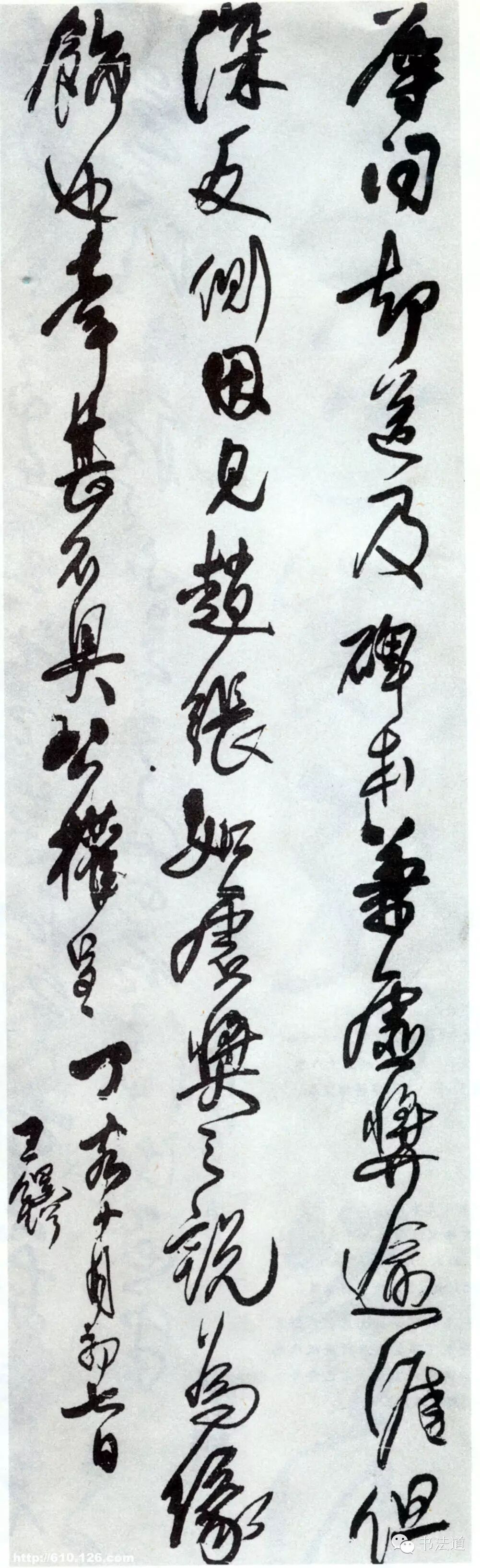 王铎《临柳公权辱问帖轴》(五十六岁作) 自署书于丁亥年(清顺治四年,1647年)。草书,绫本,凡三行,共三十八宇,纵164.9cm,横49.7cm,四川省博物馆藏。