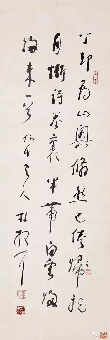 林散之是诗、书、画三绝的艺坛大家。他早年致力于画,晚年又以书法名扬天下,然而,他自认为自已是"诗第一,画第二,书第三",他自己亲手所书的墓碑为"诗人林散之"。其平生无时无地不在推敲诗作,如病卧时、睡梦中、吃饭时、走路时常不能自控地兴起作诗。甚至在坐马桶时也在沉思,忽觅得佳句急起身提裤去桌上取纸笔记下,以免遗忘,一时传为笑谈。他晚年辑成的《江上诗存》三十六卷,存诗二千多首,充分展现出他诗人的浪漫和博雅的胸怀,启功为之作序中盛赞:"老人之诗,胸罗子史,眼寓山川,是曾读万卷书,而行万里路者,发于笔下,浩浩然,随意所之。无雕章琢句之心,有得心应手之乐。"其抒情写意的诗词往往见题于画作上,与画境相辅相成,并臻其妙。在他的书法作品充溢着浓厚的诗韵,其诗词的意韵成为其书法笔墨、风格的深层内蕴,此非常人所能及。可以说,其诗韵乃其书之魂!