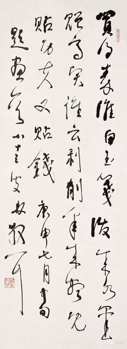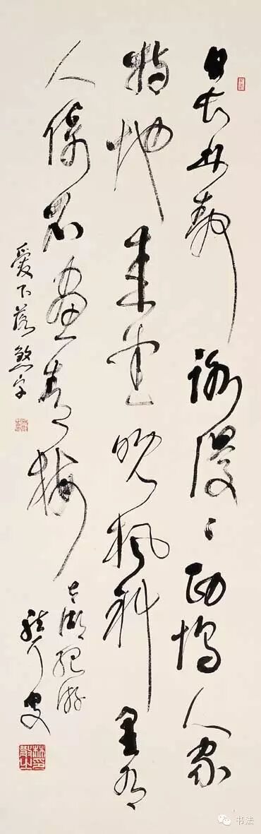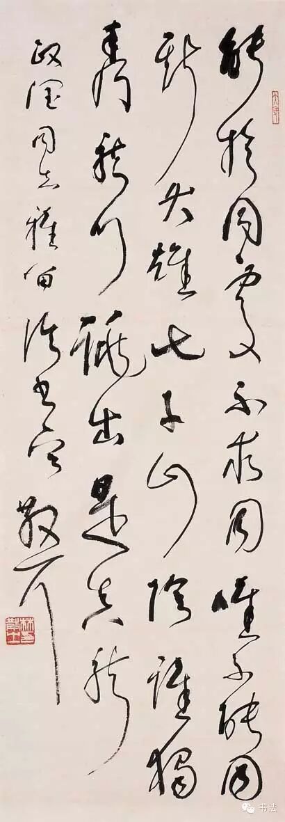 就书法的墨法而言,林散之的成就也极大。师黄宾虹,深得黄宾虹用墨之奥妙。林散之继承并发展之,将丰富的墨法自觉地运用于书法创作,是中国书法史上的重要突破。他将浓墨、淡墨、焦墨、枯墨、润墨、渴墨、宿墨等绘画诸墨法,成功地运用于书法创作,前无古人。他写字喜欢在砚池旁置一水盂,饱蘸浓墨之后,将笔尖轻轻点上一点清水,一下笔,水墨交融,千变万化,妙不可言!他为桑作楷书写的《怀素论书一则》(唐许瑶诗)草书条幅充分展现出这种水墨变化。林散之更善于用枯笔,往往在墨竭锋散之后,还能仗其超凡的控制力,写出时隐时现、若断还连的笔画来。这些大胆的创新,是同时代人所不及的。