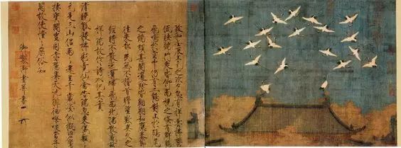 《瑞鶴圖》|莊嚴聳立的汴梁宣德門 ,門上方彩雲繚繞,十八隻神態各異的丹頂鶴,在上空翱翔盤旋,另兩隻站立在殿脊的鴟吻之上,回首相望,天空及宮殿周圍的祥和以平塗渲染,更烘托出仙鶴動飛之勢和曼妙體態,氣氛祥和吉慶。宋徽宗的書法風格挺健秀麗,稱瘦金體,在書法史上獨樹一幟。