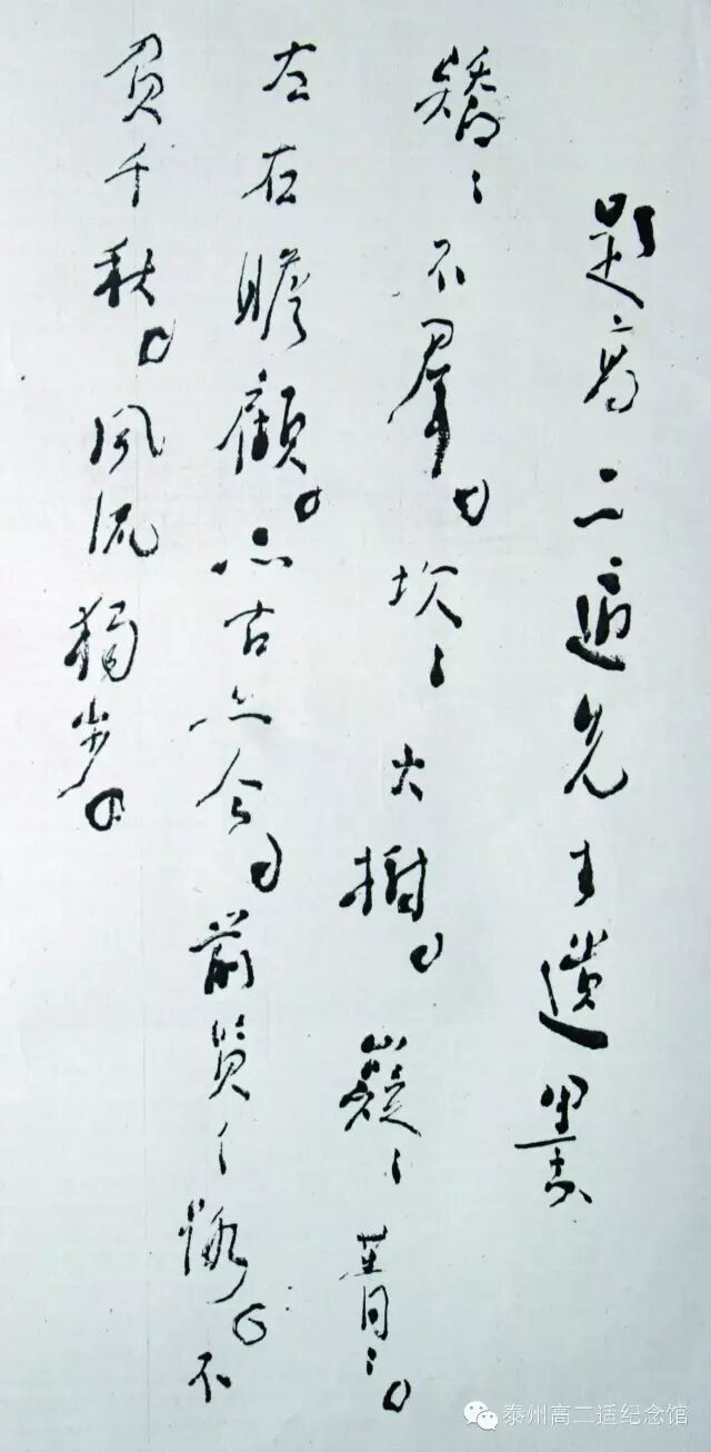 林老晚年很少外出参加活动,但是十余年来,凡是高老的作品展览及有关的纪念活动,虽是耄耋之年,衰残之驱,林老除题词书匾外,总是亲自到场。1987年3月15日,高二适遗作展览在省美术馆隆重开幕,《南京日报》在报道中写道:“就连近来很少外出的著名书法家林散之老人也坐着轮椅前来参观,并在一位学生的记录本上写下他的感受。”高老的展品陈列于三楼,林老是坐在轮椅中被抬上了三楼,而他所写下的感受,实是一首四言诗——《题高二适先生遗墨》:“矫矫不群,坎坎大树。嶷嶷菁菁,左右瞻顾。亦古亦今,前贤之路。不负千秋,风流独步。”这是一位书法大师对另一位书法大师的作品的由衷赞赏和崇高评价,表现了多么博大的胸襟和气度。