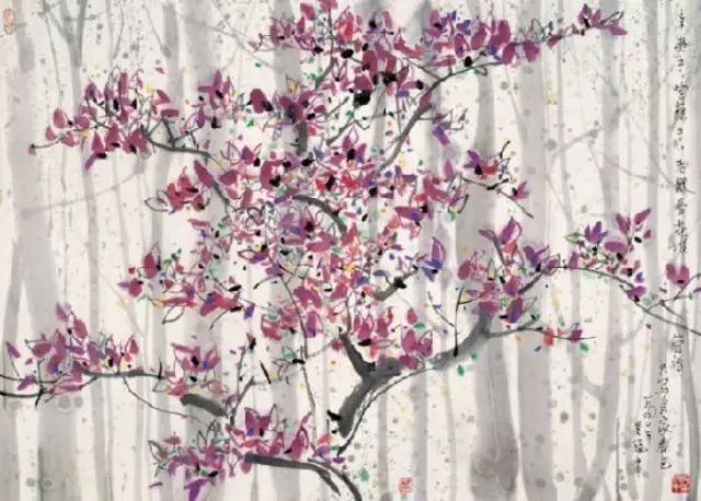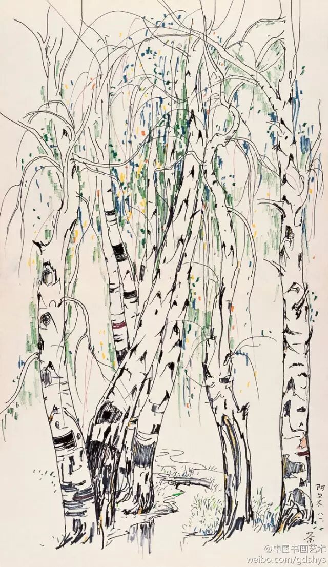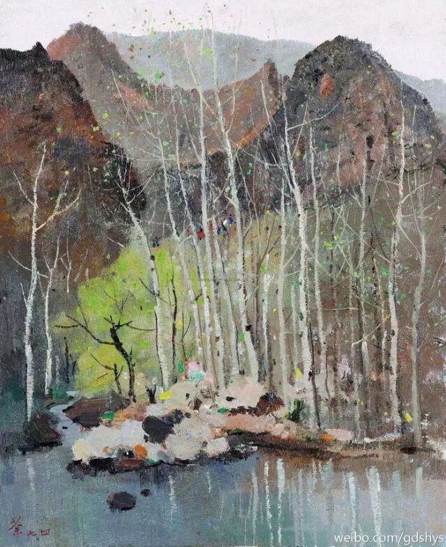 吴冠中 1974年作《初春》---- 画面主要表现了群山映衬下的几株白杨树,在初春乍暖还寒的时节茕茕孑立于天地间,既是一件风景油画,其实也可以看作是一件具有人格倾向的寓意作品,淋漓尽致地体现了画家纯真淡然的审美理想。