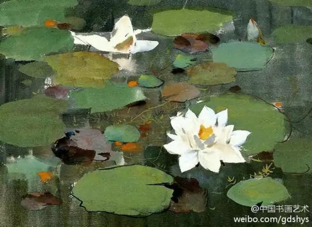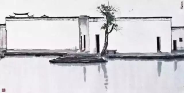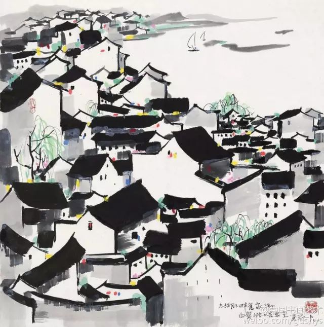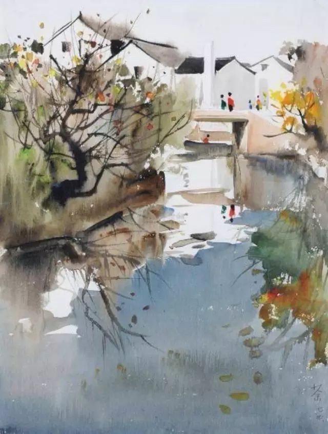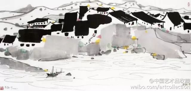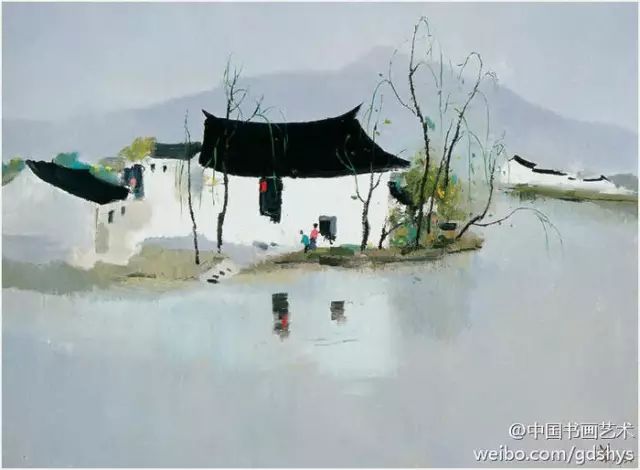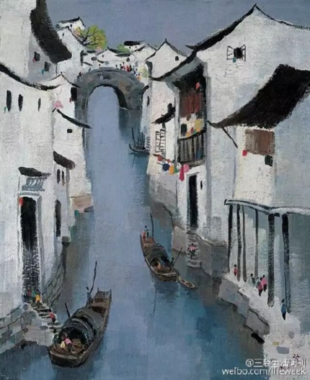 岸上白墙黑瓦的民居,用彩色和黑色错落地点出,强调了一派和谐而静谧的江南景象,整幅画将西方的材料技法和东方审美的内涵和韵致完美的结合在了一起。